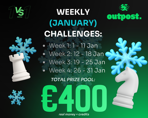 Start 2026 strong with the Weekly January Challenge on Outpost Chess. Four weekly competitions, a €400 total prize fund, real money rewards, AI & gaming credits, and lucky prizes, where every game counts, win or lose.