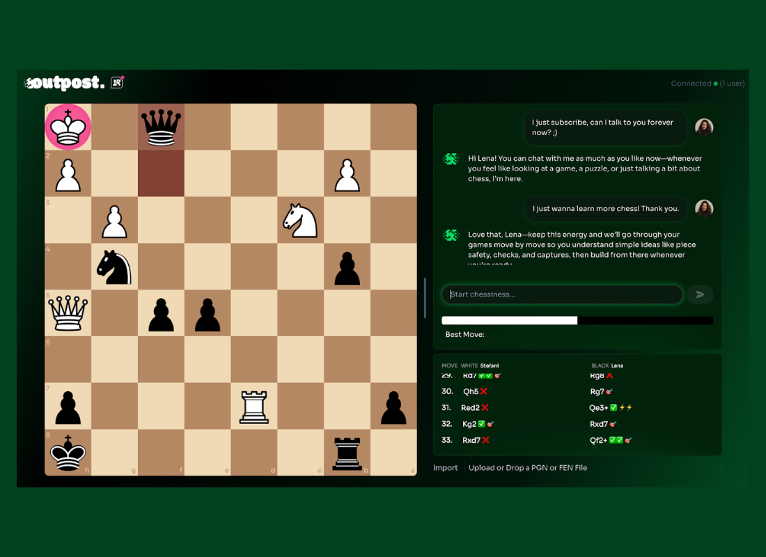 Follow Lena as she analyzes her chess game on Outpost Chess using AI Game Review. Chat with “Outposty,” your AI chess coach, ask questions about moves, and learn how to improve faster with interactive AI chess training.